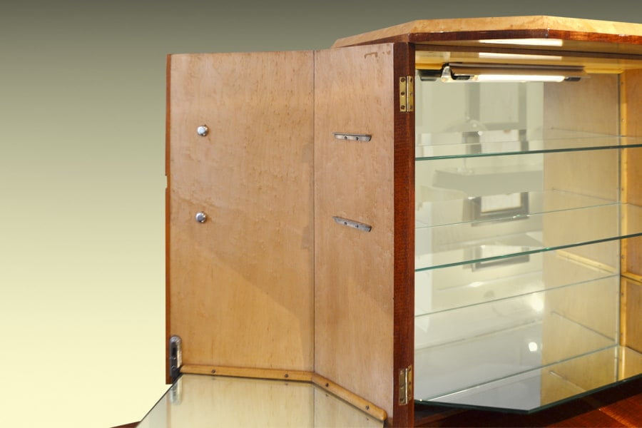 The upper section is mirrored and illuminates on opening, with maple veneers – the rest of the interior has mahogany veneers.