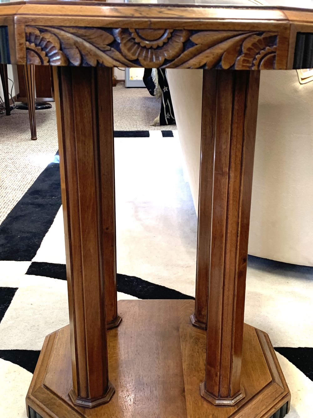 An original Art Deco octagonal coffee table. Carved frieze, reeded legs and stepped base. Excellent condition, newly polished.