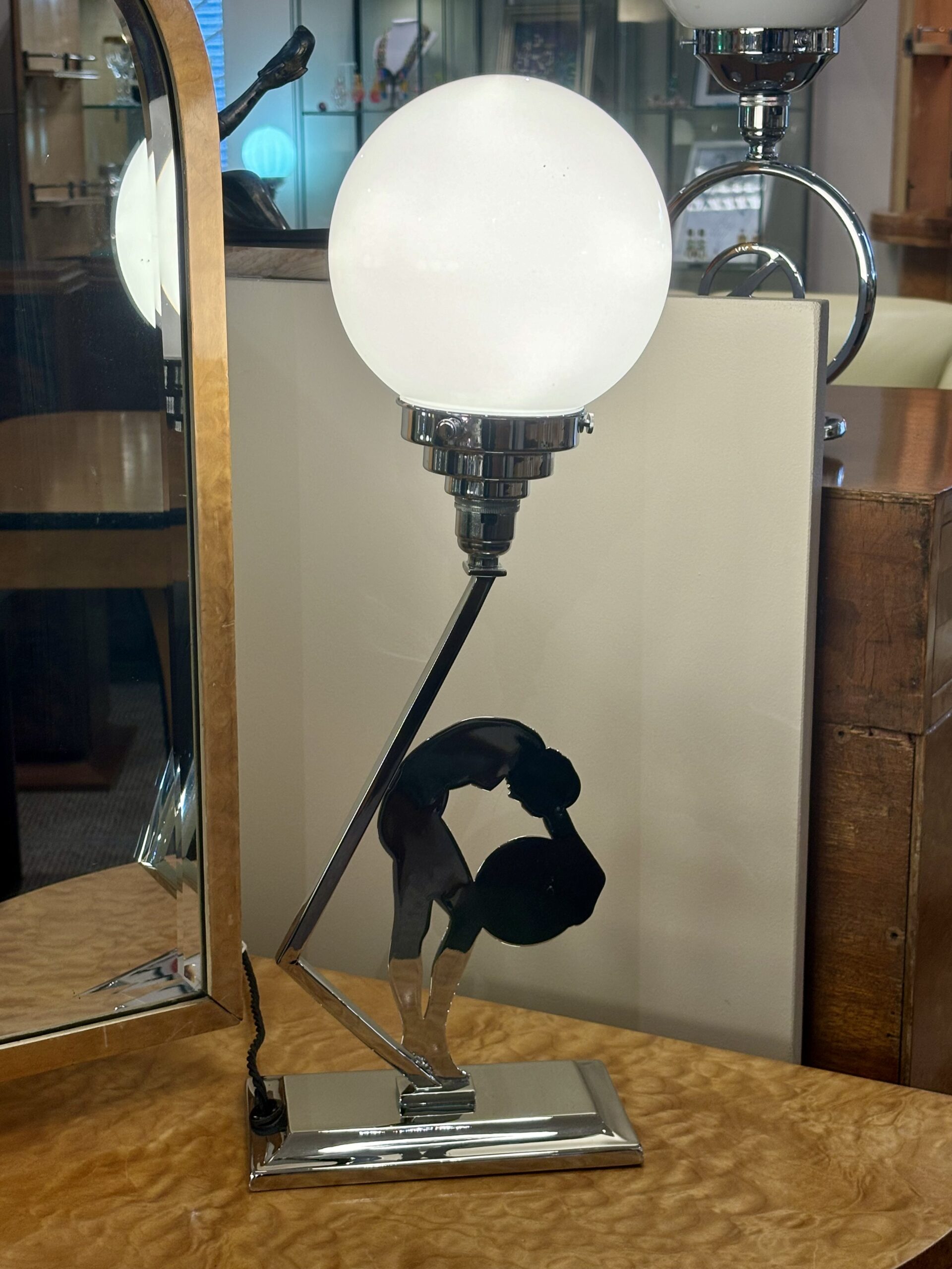Very large Art Deco Table Lamp – a nude athlete holding a ball. Newly rechromed, rewired and portable appliance tested