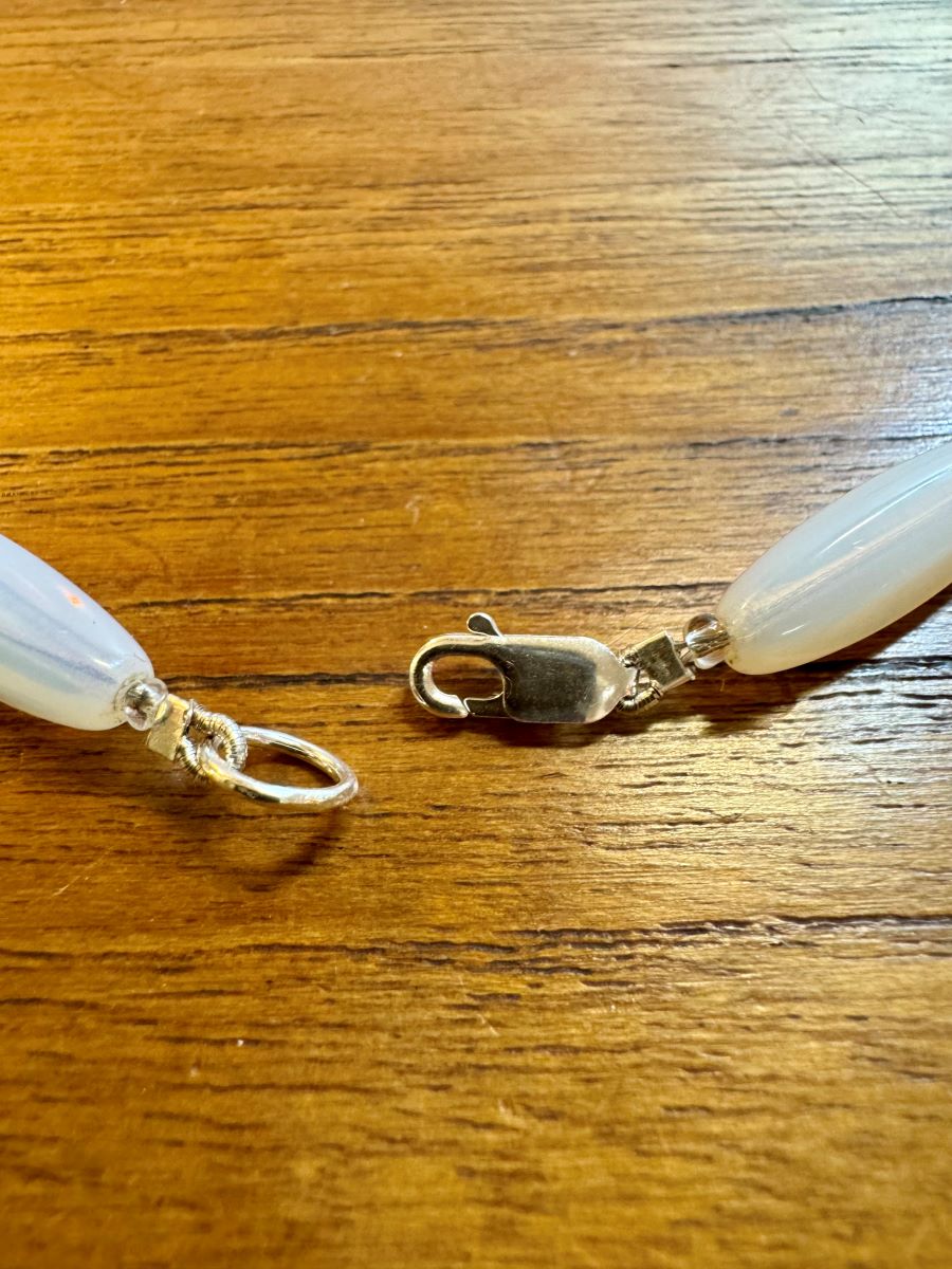 Czech 1920s opalescent glass beads, newly strung with Aurora Borealis facetted crystals and a silver clasp. These beads resemble Lalique’s opalescent glass of the Art Deco era and are highly collected. Excellent condition.