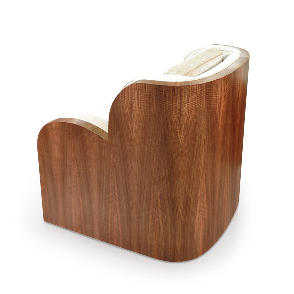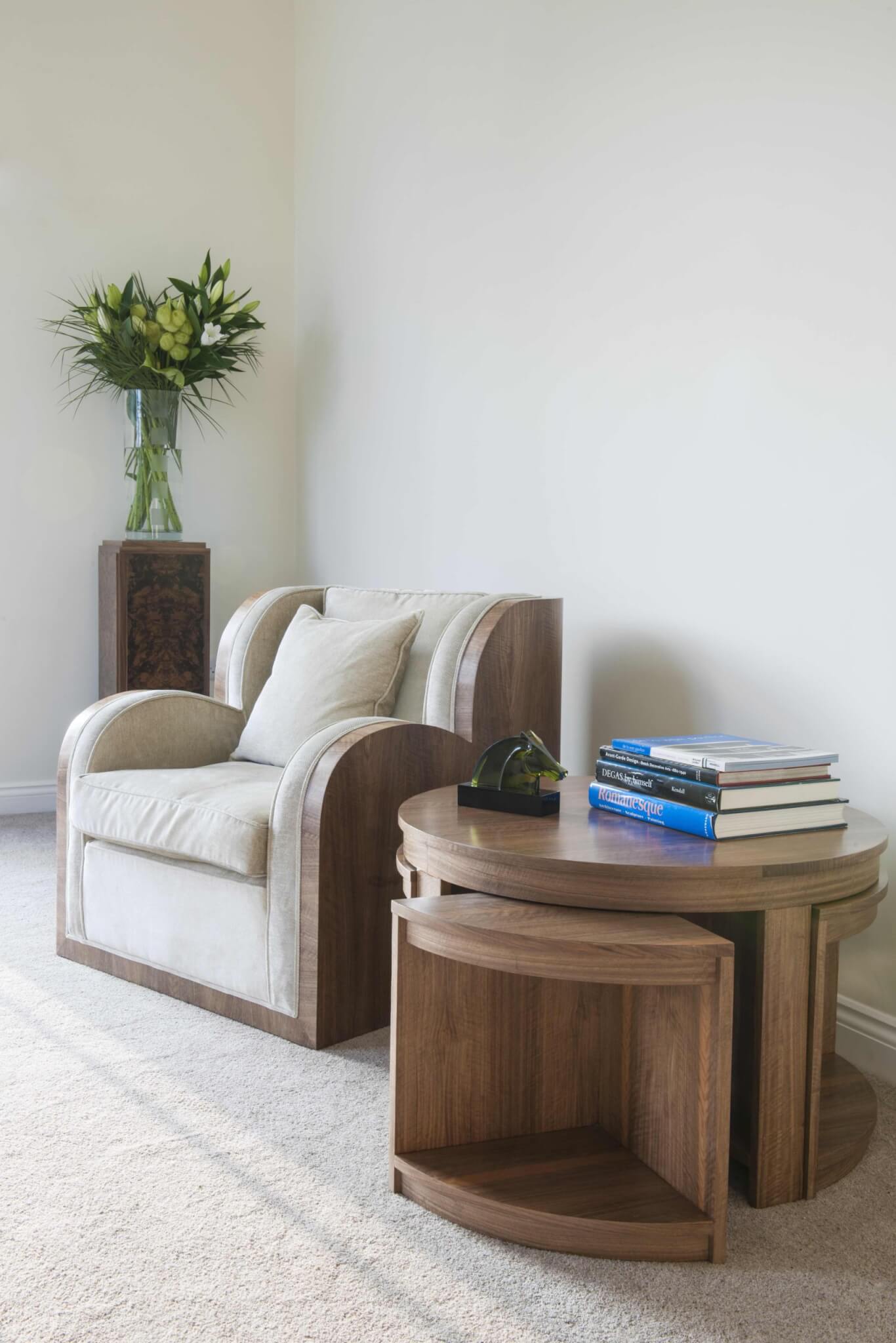 From the Period Designs Art Deco Contemporary Collection. An imposing, veneered armchair with a polyurethane matt finish. Kiln dried beech frame, glued, screwed and dowelled. Fibre filled seat and back cushions, feather and down available. Made in Britain.